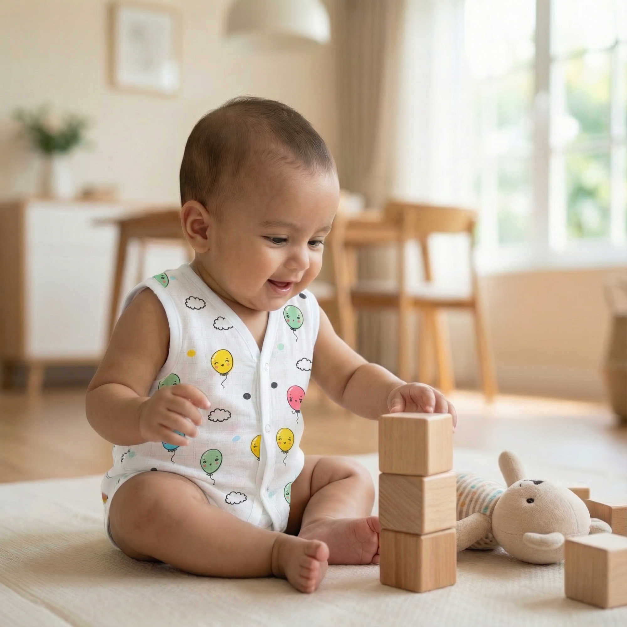 This muslin co-ord set includes a soft top and bottom crafted from breathable organic cotton. Designed for comfort and mobility, it allows babies to move freely while staying cool.