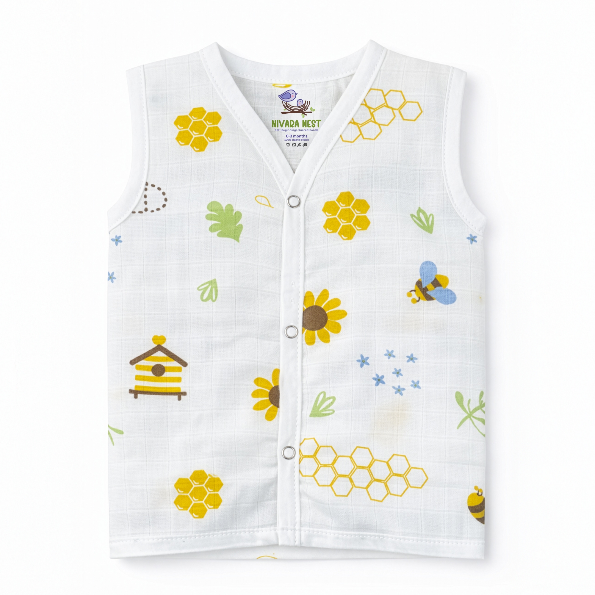 This organic muslin jhabla is thoughtfully designed for everyday baby comfort. Made with breathable cotton muslin, it helps regulate body temperature and keeps babies relaxed throughout the day. The sleeveless design allows free movement while snap buttons make dressing and diaper changes easy.