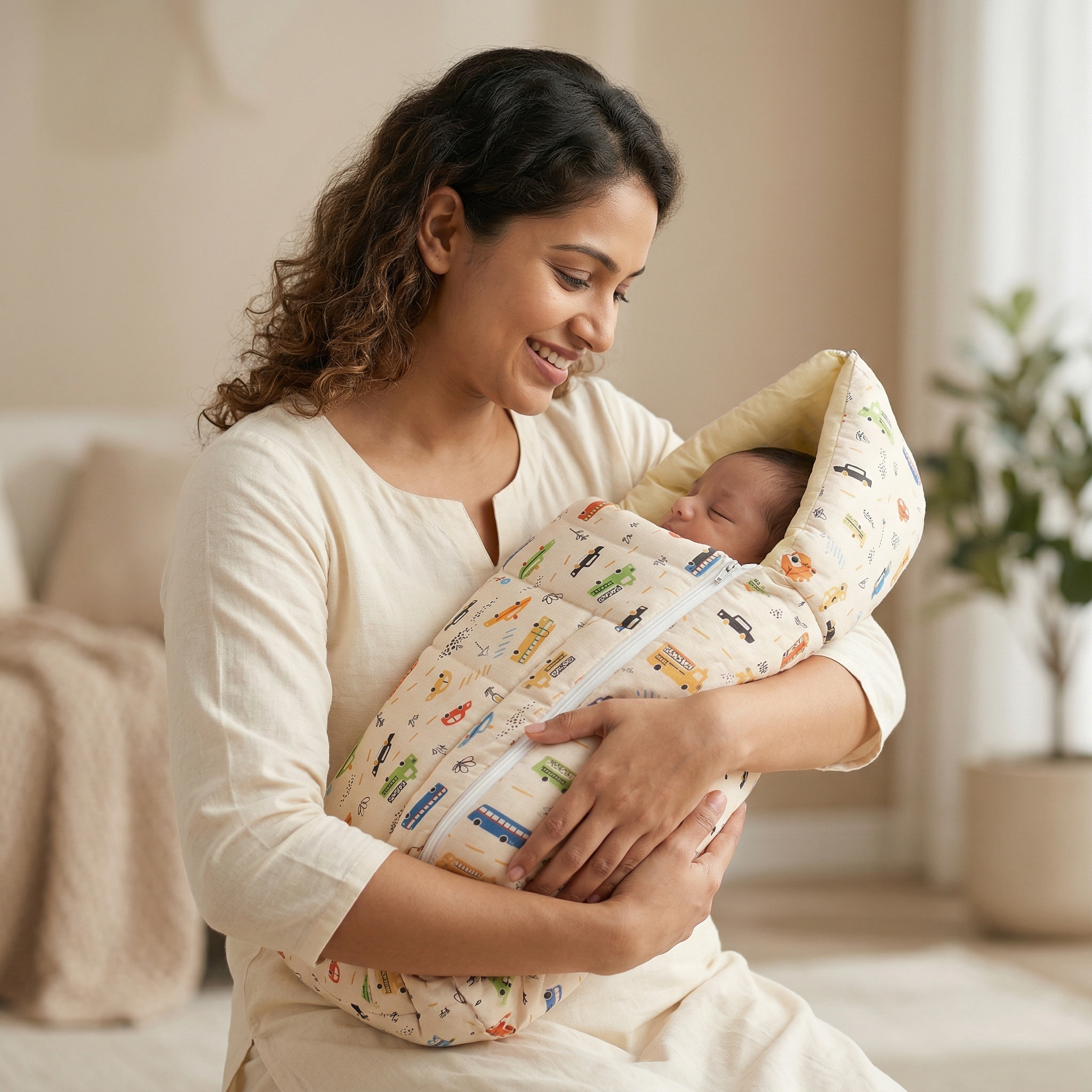 Crafted from soft pure cotton, the fabric is breathable and skin-friendly, making it perfect for delicate newborn skin. It promotes proper airflow to keep your baby cool and comfortable while preventing overheating—especially suited for Indian weather conditions. The cushioned structure supports your baby’s natural posture, ensuring comfort during sleep, rest, or lounging.